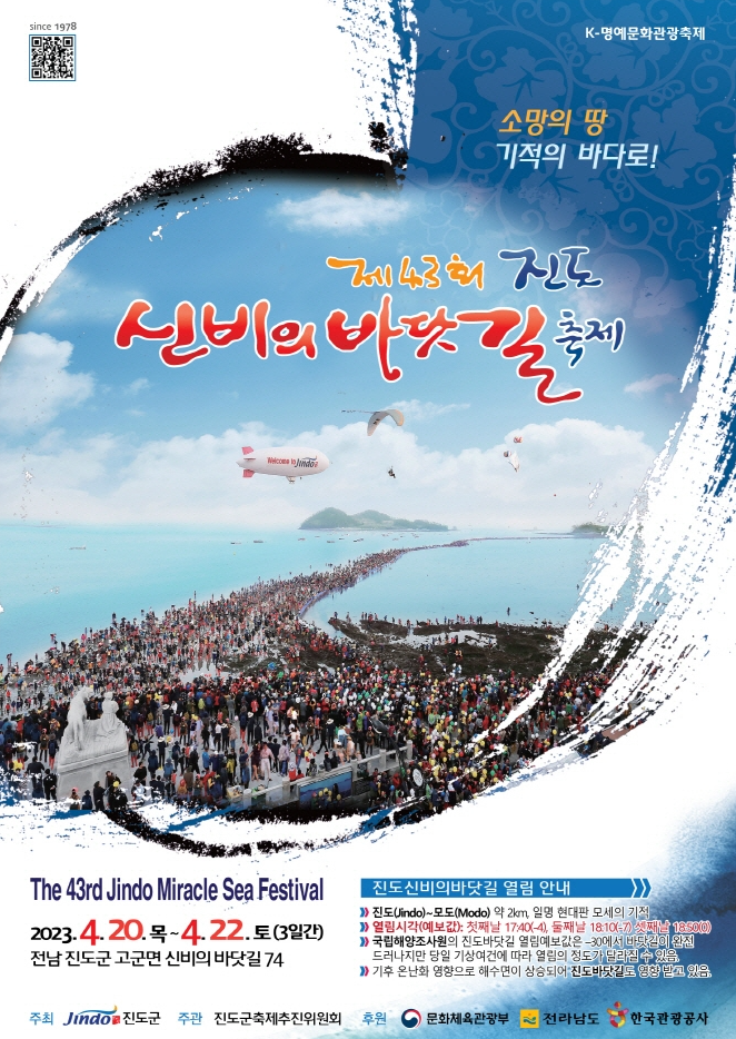 진도 신비의 바닷길은 세계적으로도 널리 알려진 축제입니다. 전라남도 진도군 고군면의 회동리와 의신면 모도 사이의 2.8km 정도의 바다가 밀물과 썰물 때 물의 높이 차이로 인해 바다밑이 40여 m의 폭으로 물 위로 드러나는 것을 뜻합니다. 이것을 바닷길이 열린다고 합니다. 이러한 신비로운 현상으로 인해 진도 신비의 바닷길 축제가 열립니다. 매년 이 바닷길이 열리는 모습을 보기 위해 국내와 해외에서 많은 관광객들이 수십만 명씩 방문해 주십니다. 바닷길이 완전히 열리고 드러나 있는 시간은 대략 1시간 정도입니다. 한 시간 동안 열리는 기적을 목격하기 위해 많은 방문객들이 몰립니다. 이러한 특별한 날 모든 관광객들을 위해 진도 고유의 민속 예술을 선보이기도 합니다. 그리고 다양한 이벤트로 볼거리와 즐길거리들을 준비해 두었습니다. 1975년 주한 프랑스 대사인 피에르 랑디 씨가 진도로 광광을 왔었습니다. 그리고 바닷길이 열리는 신비로운 이 현상을 직접 보게 되었습니다. 혼자만 알 수 없어 프랑스 신문에 소개하게 되었습니다. 그리고 현대판 모세의 기적이라고도 불리게 되는 이 신비한 바닷길은 전 세계적으로 알려져 유명해졌습니다. 신도 신비의 바닷길 축제는 원래 뽕할머니의 제사로 시작되었습니다. 원형 그대로의 민속민요와 남도 들노래와 다시래기와 씻김굿 등의 국가지정 무형문화재와 만가와 북놀이 등 주옥같은 공연이 펼쳐집니다. 국내와 해외에서 방문해 주신 관광객들의 흥겨움을 더해 줄 진도 고유 민속예술인 강강술래도 있습니다. 볼거리가 많고 축제 때 실시되는 물고기 잡이 행사인 개매기와 조개잡이 체험과 홍주 시음회 등 다양한 체험행사도 참여하실 수 있습니다.